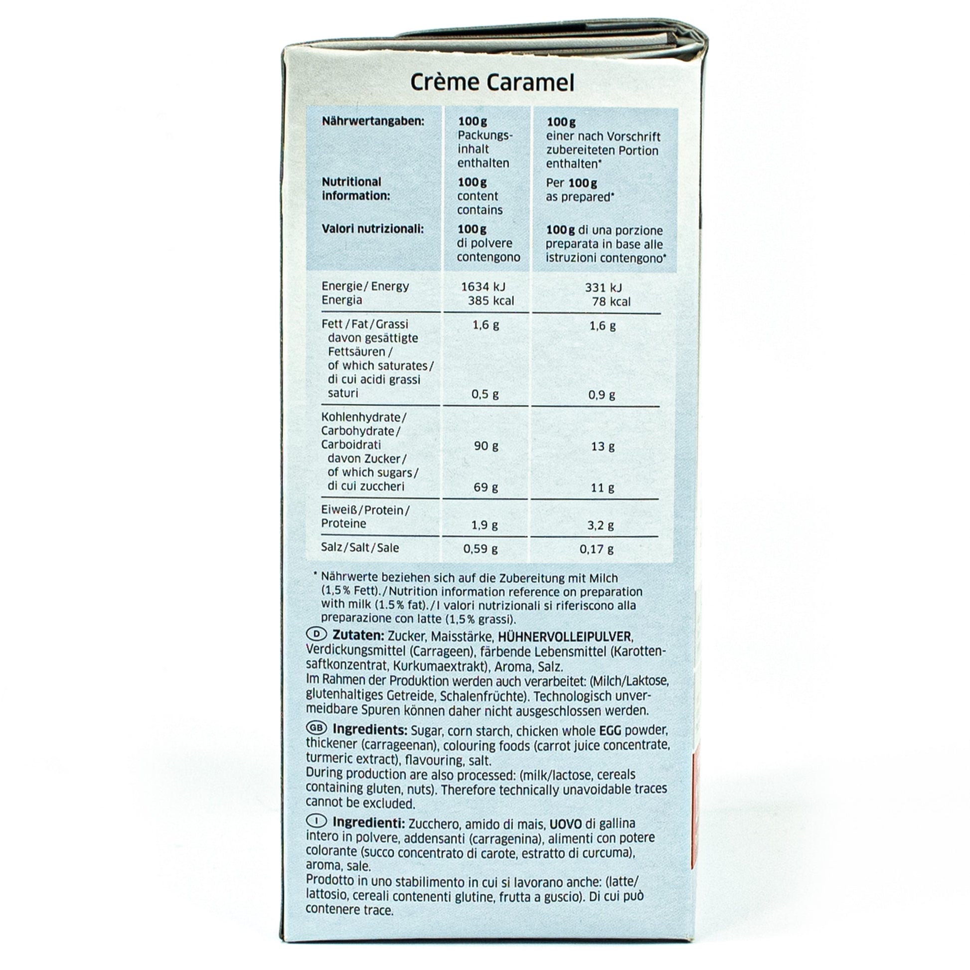 - EINFACHE ZUBEREITUNG - 100 g Dessertpulver auf 1 l Milch - Die Trockenmischung mit einem Teil der kalten Milch anrühren. Die verbliebene Milch aufkochen, die angerührte Masse eingießen und unter Rühren ca. 1 Minute kochen. Karamellsoße (ca. 10 g) in eine Portionsform (Timbal) geben und die Crème Caramel darauf portionieren. Danach für 1-2 Stunden kalt stellen. Anschließend den Rand mit einem spitzen Messer lösen und stürzen. Tipp: Die Karamellsoße kann auch nach dem Stürzen über der Crème Caramel dosiert werden