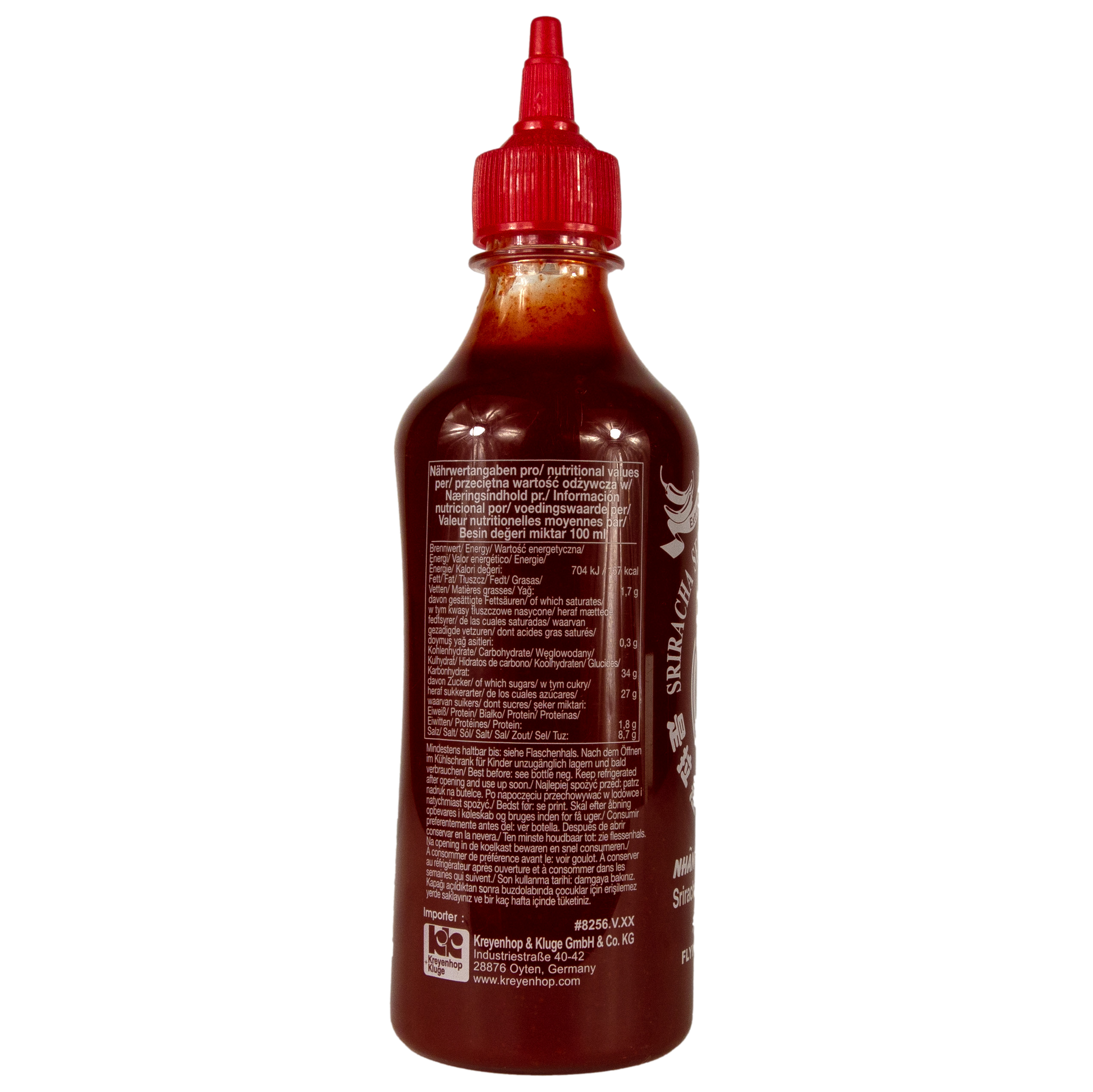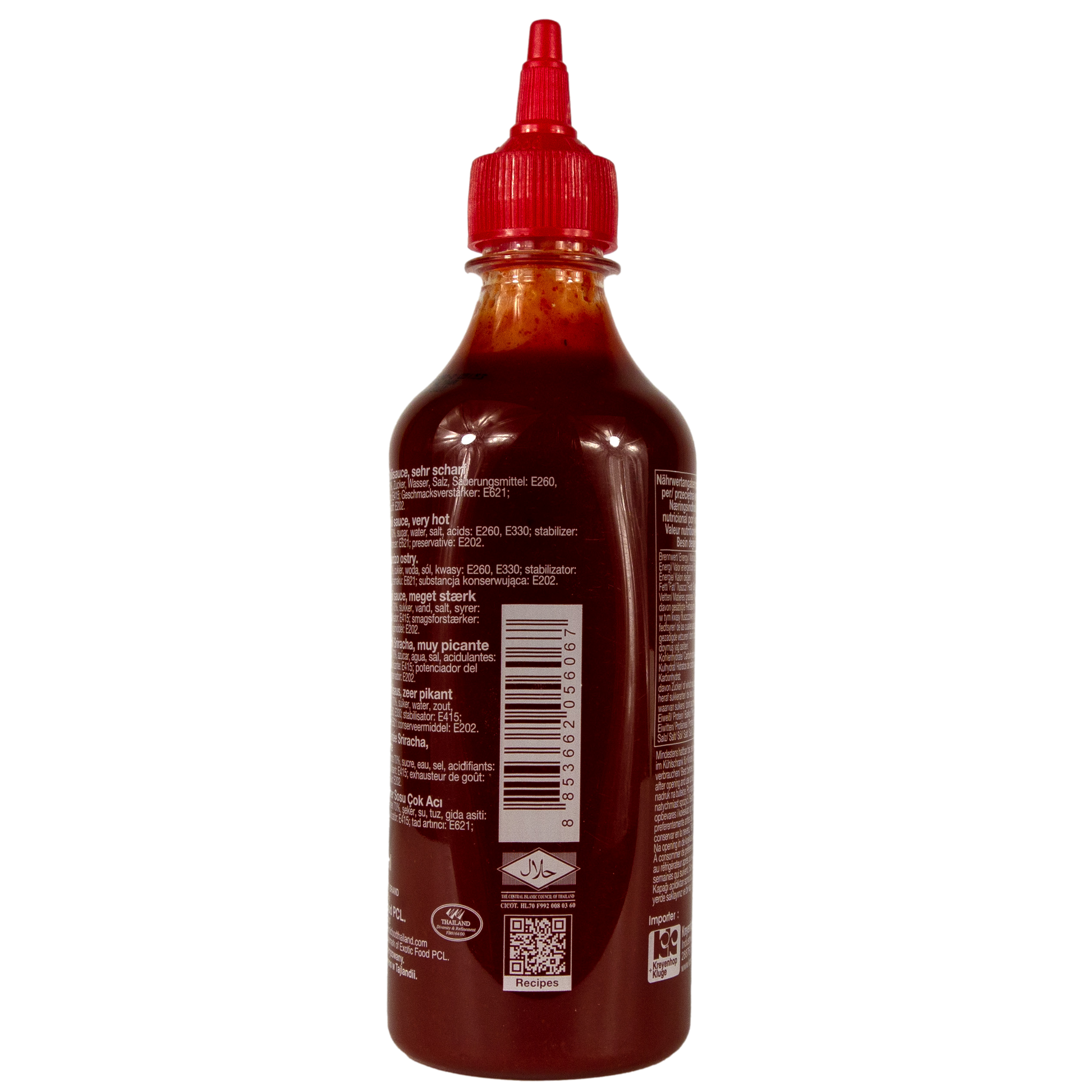 Zutaten: Chilli 70 %, Zucker, Wasser, Salz, Säuerungsmittel: Essigsäure (E260), Citronensäure (E330);Verdickungsmittel: Xanthan (E415); Geschmacksverstärker: Mononatriumglutamat (E621);Konservierungsstoff: Kaliumsorbat (E202)