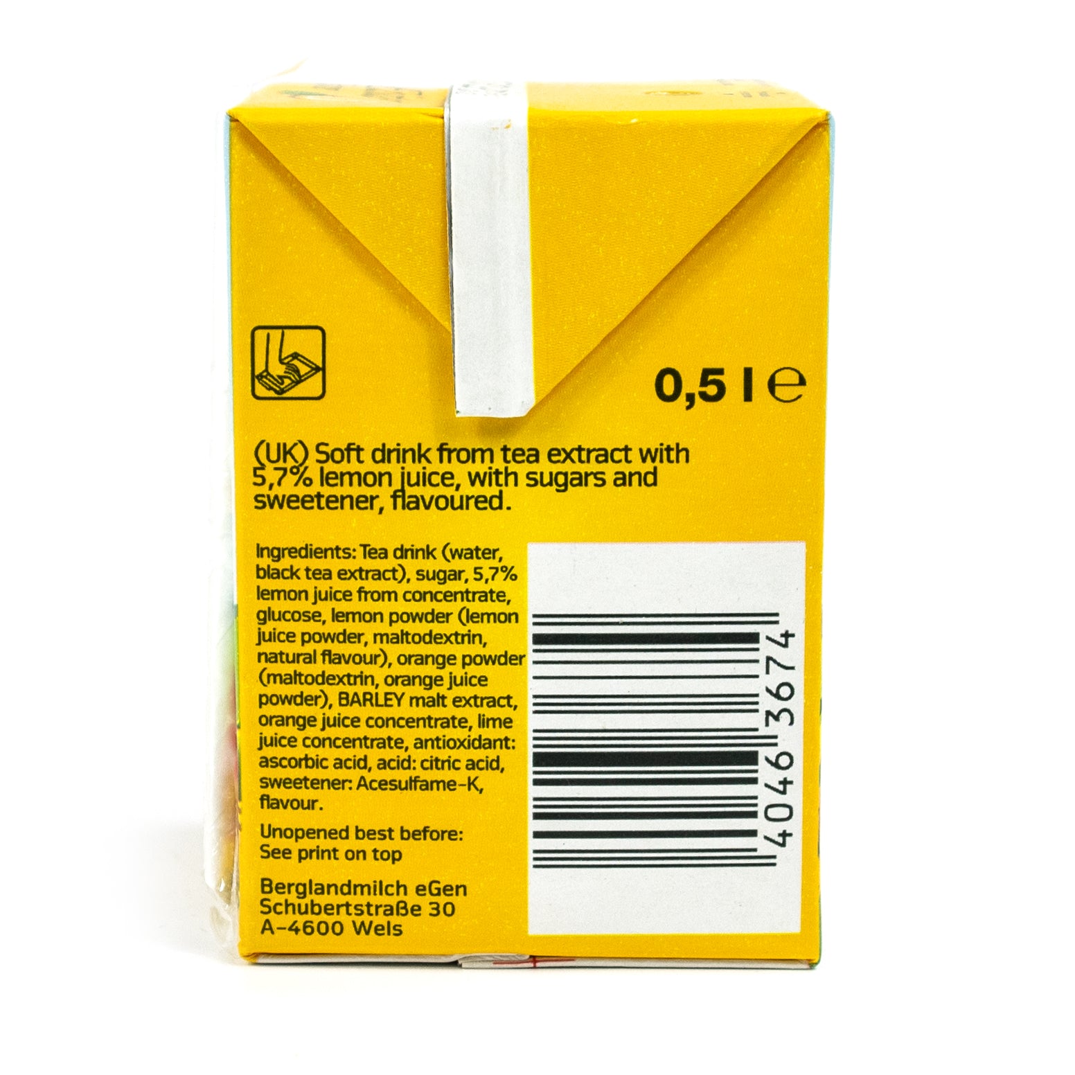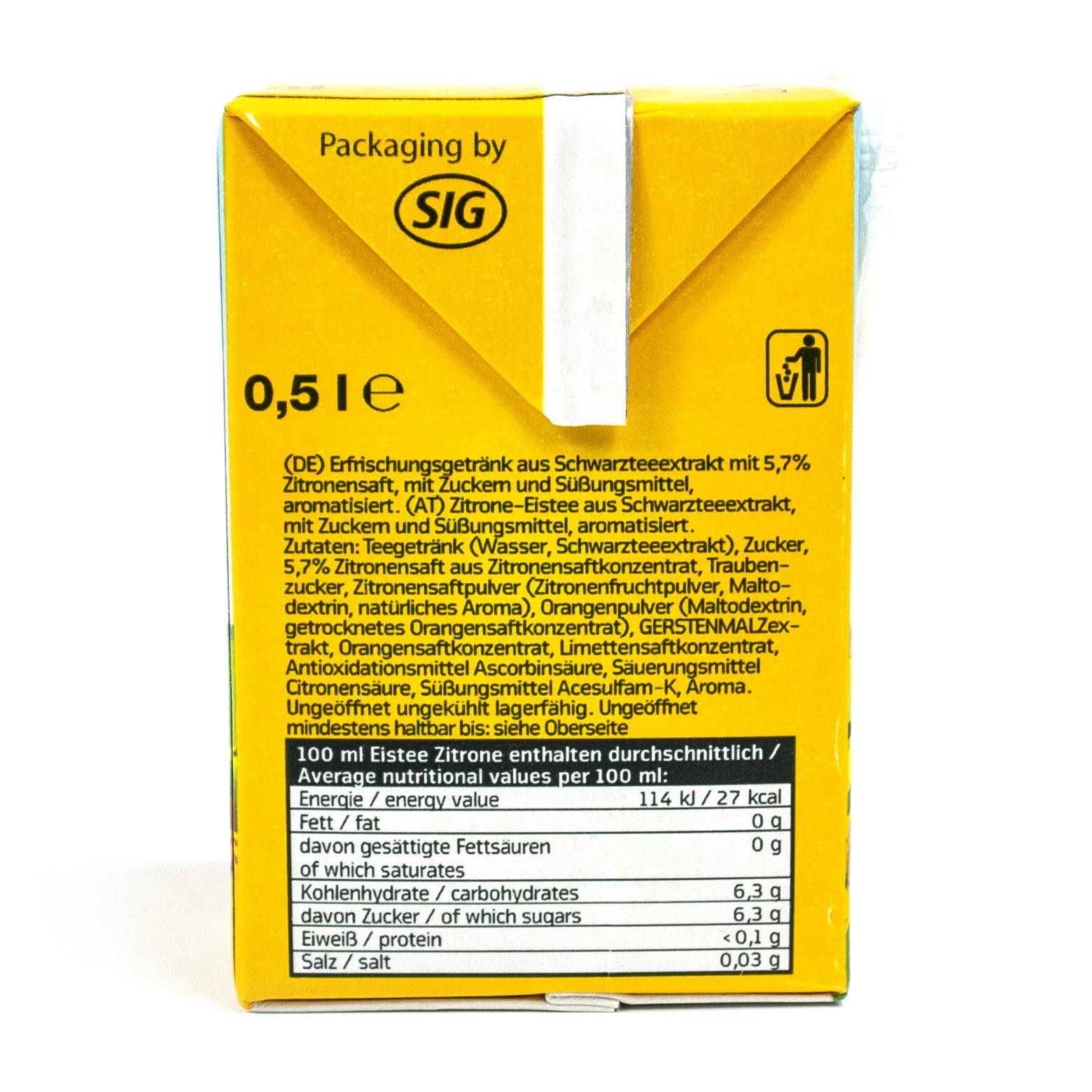 Zutaten: Teegetränk (Wasser, Schwarzteeextrakt), Zucker, 5,7% Zitronensaft aus Zitronensaftkonzentrat, Traubenzucker, Zitronensaftpulver (Zitronenfruchtpulver, Maltodextrin, natürliches Aroma), Orangenpulver (Maltodextrin, getrocknetes Orangensaftkonzentrat), Gerstenmalzextrakt, Orangensaftkonzentrat, Limettensaftkonzentrat, Antioxidationsmittel Ascorbinsäure, Säuerungsmittel Citronensäure, Süßungsmittel Acesulfam-K, Aroma