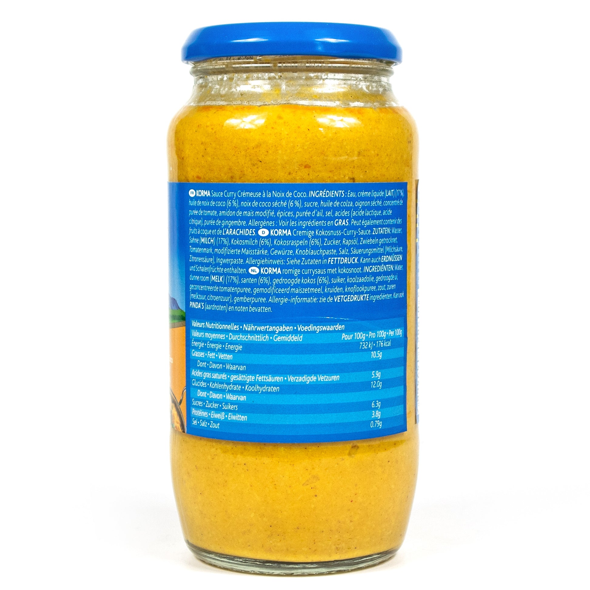 Zutaten: Wasser, Sahne (MILCH) (17%), Kokosmilch (6%), Kokosraspel (6%), Zucker, Rapsöl, Zwiebeln getrocknet, Tomatenmark, modifizierte Maisstärke, Gewürze, Knoblauchpaste, Salz, Säuerungsmittel: Milchsäure (E270), Citronensäure (E330); Ingwerpaste Kann Spuren von NÜSSE und ERDNÜSSE enthalten