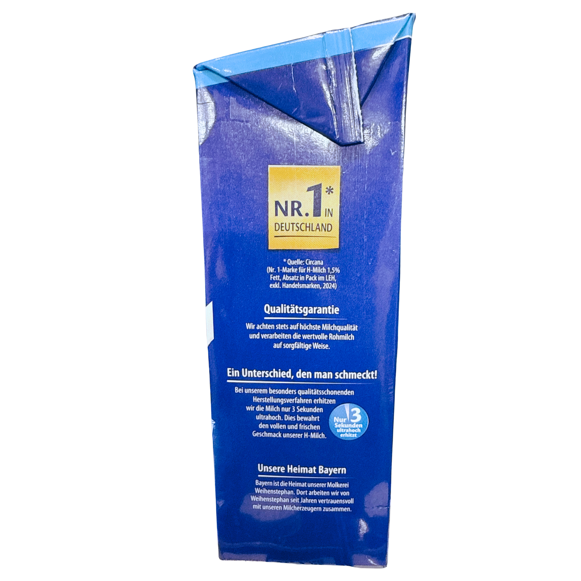 Die H-Milch mit 1,5 % Fett von Weihenstephan kommt aus Bayern. Dort achtet die Firma Weihenstephan auf die beste Milchqualität mit den höchsten Ansprüchen. So wird die Milch durch einen besonders schonenden Prozess erwärmt, wodurch die Hitzebelastung um 80% geringer ist als bei herkömmlichen Verfahren. Dadurch kommt der besonders frische Geschmack.