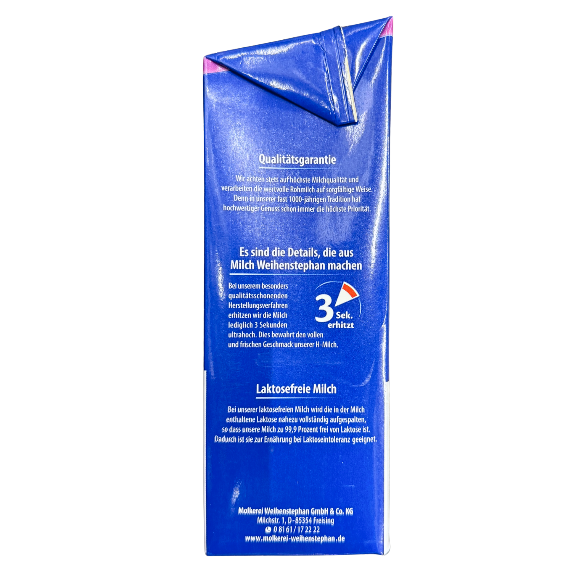 Bei der laktosefreien Milch von Weihenstephan wird die in der Milch enthaltene Laktose nahezu vollständig aufgespalten, so dass die Milch zu 99,9% frei von Laktose ist. Dadurch ist sie zur Ernährung bei Laktoseintoleranz geeignet. Im Gegensatz zu herkömmlicher laktosefreier H-Milch bleibt durch das Verfahren von Weihenstephan der natürliche weiße Farbton der Milch erhalten.